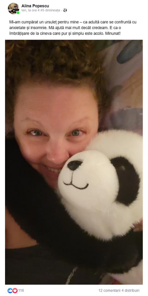 • Nu mă așteptam să plâng la prima îmbrățișare. Ursulețul este atât de liniștitor. A fost ca și cum cineva m-ar fi îmbrățișat pentru prima dată după mult timp. Sunt foarte recunoscătoare.